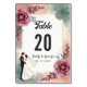 Este elegante número de mesa de boda floral acuático es perfecto para un boda moderno. El diseño romántico presenta un elegante marco floral acuático con un ilustracion de novia y novio y una caligrafía negra sobre un fondo blanco.
