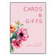 Esta señal para la mesa de la boda presenta un fondo rosa suave adornado con un arreglo floral de acuarela en tonos de melocotón, coral y azul claro. El diseño incluye tipografía elegante con "TARJETAS Y REGALOS" que se muestra de manera prominente en la parte superior en una fuente serif en negrita, mientras que "gracias" está escrito en un estilo más claro y en cursiva debajo. La estética general es romántica y delicada, perfecta para expresar gratitud en su evento especial. La composición equilibrada y la paleta de colores armoniosa crean una atmósfera cálida y acogedora, lo que la convierte en una adición ideal para cualquier celebración de boda.