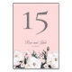 Delicada cama de rosas blancas en la parte inferior de esta elegante tarjeta boda rosa número de mesa. Tipografía gris personalizable para número de tabla, nombres de recién casados y fecha del evento.