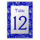 Una simple tarjeta con un motivo floral plateado sobre un rico fondo azul real. Puede cambiar el color y el estilo de letra en el menú personalizar. Forma parte de una suite boda que combina con una invitación, un menú y muchos otros elementos.