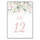 Números de mesa con un borde de gota floral de acuarela de rosas rosa rubor y verde salado. Nota: Tendrá que comprar y editar estas tarjetas de tabla una a la vez si desea que los números se impriman previamente.