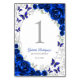 Royal blue silver Quinceanera celebration table number cards. Features, script font, silver butterflies, watercolor roses and tiara. Perfect for an elegant princess style glam celebration. Personalize with your own details. Printed Zazzle invitations or instant download digital printable template.