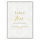 "Número de Mesa Script Elegante Encaje Blanco Boda Diez 10." Fondo con patrón de damasco blanco con aspecto de encaje y tipografía de script con brillo dorado "Número de mesa once". Están disponibles los números del 1 al 12 y podemos crear números adicionales para bodas más grandes, ¡solo envíanos un mensaje! Diseño y arte creados por la artista internacionalmente licenciada Audrey Jeanne Roberts, derechos de autor.