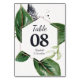 Número de mesa moderno y de moda con un hermoso ilustracion de hojas de selva tropical verde. Edite fácilmente sus detalles en fuentes grises oscuras contemporáneas sobre una forma geométrica blanca con un marco dorado moderno (oro falso - impreso). Esta tarjeta de número de tabla es parte de la colección "Tropical Jungle Boda" con muchos elementos de coordinación para crear una suite boda única.