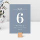 Sencillo Color Sólido Dusty Blue Wedding Número De Mesa De La Cena. Esta moderna tarjeta de mesa de moda es sencilla, clásica y elegante, con un color de fondo sólido y un tipo de letra caligrafía con bonito con cruz. Mostrado en la nueva autopista. Disponible en varias opciones de color, o no dude en editar los colores desde el editor (haga clic en personalizar mientras personaliza). Para ver más, busque las colecciones de bodas 2022 de Moda Paperie para ver todos los diseños de moda y colores bodas para este año.