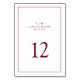 Simple número de tabla boda con un diseño elegante e intemporal con su monograma de dos letras, nombres, fecha y número de tabla rodeados de un borde delgado. Todos los elementos de diseño son de color burdeos sobre un fondo blanco y pueden cambiarse a cualquier color que desee en la herramienta de edición de diseño. Un diseño limpio y clásico perfecto para una pareja que quiere un número de mesa de estilo tradicional con un toque moderno. Agregue cada número de tabla a su carrito individualmente.