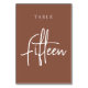 Las tarjetas de número de tabla simple y de moda en color de tierra rojizo marrón y blanco hacen una declaración elegante en su boda o evento. Las funciones de diseño "table [number]" se encuentran en una mezcla de letras clásicas de sif y manuscritas. El diseño se repite en ambos lados. Las tarjetas numeradas individualmente se venden por separado; solicite cada número de tabla individualmente de nuestra colección.