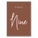 Las tarjetas de número de tabla simple y de moda en color de tierra rojizo marrón y blanco hacen una declaración elegante en su boda o evento. Las funciones de diseño "table [number]" se encuentran en una mezcla de letras clásicas de sif y manuscritas. El diseño se repite en ambos lados. Las tarjetas numeradas individualmente se venden por separado; solicite cada número de tabla individualmente de nuestra colección.
