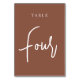 Las tarjetas de número de tabla simple y de moda en color de tierra rojizo marrón y blanco hacen una declaración elegante en su boda o evento. Las funciones de diseño "table [number]" se encuentran en una mezcla de letras clásicas de sif y manuscritas. El diseño se repite en ambos lados. Las tarjetas numeradas individualmente se venden por separado; solicite cada número de tabla individualmente de nuestra colección.