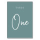 Las tarjetas de número de tabla simples y de moda en blanco y verde azulado polvoriento hacen una declaración elegante en su boda o evento. Las funciones de diseño "table [number]" se encuentran en una mezcla de letras clásicas de sif y manuscritas. El diseño se repite en ambos lados. Las tarjetas numeradas individualmente se venden por separado; solicite cada número de tabla individualmente de nuestra colección.