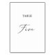 Este delicado número de cinco mesas de la mesa de caligrafía negra es perfecto para un boda moderno. El romántico diseño minimalista presenta una bonita y elegante tipografía negra sobre un fondo blanco con un aspecto limpio y sencillo. La tarjeta se imprime en la parte delantera y trasera (doble cara). Otros números de tabla de la colección se venden por separado.
