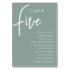 Las tarjetas de número de tabla simples y de moda en Eucalyptus Green y white hacen una declaración elegante en su boda o evento. Las funciones de diseño "table [number]" se encuentran en una mezcla impresionante de letras clásicas de sif y manuscritas, con nombres de invitados individuales debajo. El diseño se repite en ambos lados. Las tarjetas numeradas individualmente se venden por separado; solicite cada número de tabla individualmente de nuestra colección.