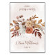 Guíe a sus huéspedes con cálida y rústica elegancia utilizando este diseño de tarjetas de personalizable, perfecto para una celebración otoñal. Con un bonito arreglo de hojas de cascada y flores en ricos tonos de óxido, naranja quemado y terracota, este diseño le da un toque de encanto bohemio a su mesa. La tipografía clara de los nombres y los números de las mesas garantiza una fácil lectura, mientras que la disposición del diseño es perfecta para plegarse en una elegante forma de tienda, realzando la decoración del evento con su estética sepultada y atractiva.