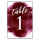 Estas sencillas y modernas tarjetas de color burdeos harán que su mesa de eventos sea la adición perfecta. La acuarela da un toque de diseño, pero mantiene un aspecto moderno. Este diseño de número de mesa es perfecto para los amantes de las elegantes paletas de color profundo.