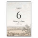 Vintage French country toile wedding table numbers card with a classic pastoral landscape illustration. Easily personalize the table number, couple names and wedding date directly on the product page preview.