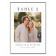 This wedding table card features a classic and elegant design with a central photograph of two individuals in a garden setting, surrounded by soft, natural tones. The layout is clean and balanced, with ample white space enhancing the serene mood. The typography uses a sophisticated serif font for the table number and names, adding to the formal yet inviting aesthetic. Perfect for personalizing your event, this card captures warmth and happiness, making it ideal for celebrating special moments like weddings.