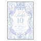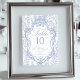 Soft delft blue floral table number card, designed in a refined blend of chinoiserie and French toile de Jouy style. The soft botanical illustrations frame an arched layout featuring an elegant wedding crest monogram, perfect for couples who love vintage, historic, and European-inspired aesthetics. Classic script typography pairs beautifully with the ceramic-blue palette, making this design an effortless nod to the tradition of “something blue.” Fully customizable with your names, wedding crest and table number, it’s an exquisite choice for any romantic or sophisticated wedding theme.