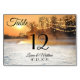 Una cédula de números de mesa festiva con una escena de invierno al atardecer con luces de cuerda festivas.