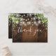 Una elegante cuerda ilumina madera rústica de granero con boda verde, tarjeta de recepción, personalizada con un mensaje especial y los nombres de la novia y del novio. Diseñado por Thisisnotme©