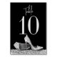 Elegante tarjeta Glam Silver y Black High Heel Stiletto Shoe Table Number con diseño moderno y fuentes, perfecta para su fiesta de cumpleaños, ducha de novia, evento de negocios de moda, dulce 16, quinceanera, bat mitzvah o cualquier fiesta que celebre lujo y diversión con un tema de zapatos de tacón alto.