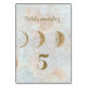Elegante tema de la Nueva Era purpurina de oro de zodiac waxing Moon Boda Número de tabla Tarjeta plana con fondo celestial azul celeste moteado y letra decorativa caramelo tipografía texto que se puede personalizar fácilmente con tu propia redacción. Un diseño único y elegante para la pareja moderna a la que le gusta estar de moda, pero con un enfoque original y elegante. Artículos y accesorios de papel para bodas coordinadores adicionales disponibles en este diseño para crear un tema unificado.