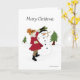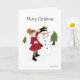 Tarjeta de muñeco de nieve y niña con abrigo rojo