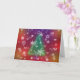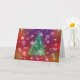 Una dispersión de copos de nieve blancos, hojas de acebo y bayas, estrellas y árboles de pino contra un fondo brillante de rojo, naranja, dorado y púrpura, con una suave forma de árbol de Navidad verde en el medio.