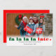 ¿Olvidaste enviar tu tarjeta de Navidad a tiempo? Fa la la la late es la tarjeta perfecta para aquellos que siempre llegan un poco tarde. La parte frontal de la tarjeta presenta la frase “Fa La La Late” en los colores mostrados, junto con tu foto y mensaje personalizados. Puedes cambiar todos los colores en este diseño divertido y simple utilizando la herramienta de personalización.