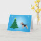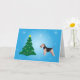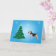 Un Welsh Terrier está de pie de perfil mirando un árbol de Navidad adornado con luces y una estrella. Todo está sobre un fondo degradado azul con estrellas brillantes sencillas. El interior dice: "¡Disfruta de la magia de la temporada!"