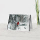 Una tarjeta de Navidad elegante que ofrecía una fotografía de un cardenal se encaramó en un árbol de pino en un día de invierno nevoso. Dentro del top ofrece otra foto de un cardenal, este vez en medio de ramas heladas. El top lee, "paz, alegría, amor," mientras que la parte inferior interior lee "Felices Navidad."