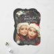 Tarjeta de Navidad contemporánea con forma de corchete recortado con hermosas flores blancas y rojas, ramas de pino y bayas sobre un fondo de pizarra moderno.
