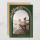Tarjeta de Navidad con foto moderna. Diseño de arco redondeado de moda presenta un arco iris de arco dorado pálido enmarcando tu foto. Acompañado de follaje botánico invernal en acuarela sobre un fondo verde oscuro. Fácil de personalizar con tu texto y foto