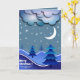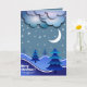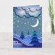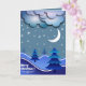 Este diseño de tarjeta de vacaciones personalizable presenta una escena nocturna de Navidad con árboles de pino azules, cielo estrellado y luna.