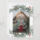 Una festiva tarjeta de vacaciones de Navidad roja, verde y blanca que presenta una negrita letra script y verdor de acuarela con hojas y bayas. Hace una excelente tarjeta de saludo personal o empresarial para las fiestas.