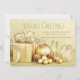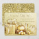 Tarjeta de Navidad corporativa elegante con guión dorado de Season's Greetings sobre un fondo dorado festivo. Esta hermosa tarjeta de Navidad corporativa de regalo y adorno dorado se personaliza fácilmente simplemente agregando su mensaje y logotipo en el estilo de fuente y color de su elección.