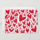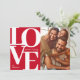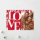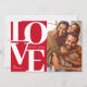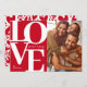 Tarjeta de Navidad moderna con fondo rojo tradicional, letras grandes y negritas que dicen 'AMOR', y las palabras 'paz y alegría' en una fuente de letra elegante, el nombre de su familia, y una plantilla de foto para que la reemplace con la suya. En el reverso hay un diseño de patrón de corazones.