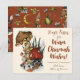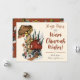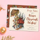 Difunde alegría y risa esta temporada navideña con estas divertidas tarjetas de Navidad con tema de hongos. El diseño presenta una ilustración pintada a mano de un alegre hongo construyendo un muñeco de nieve fuera de su casa de hongo roja. El texto dice: "Abrazos, besos y deseos cálidos de Chrismush!" Crea tus propias tarjetas de Navidad únicas agregando tu nombre o apellido.