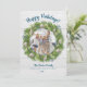 Para su tarjeta de Navidad con tema náutico o de playa, esta tarjeta cuenta con una corona de siembre adornada con ornamentos de conchas blancas y bayas azules, con espacio para su foto dentro de la corona en la parte delantera, y espacio para 3 fotos en la parte trasera, con su saludo personalizado, nombres y fecha.