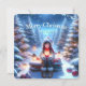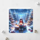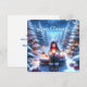 Tarjeta de Navidad tradicional de fantasía en el bosque de abetos de Navidad niña sosteniendo un regalo