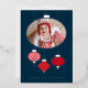 Una simple tarjeta de Navidad con foto para compartir esos recuerdos preciosos. El auténtico papel de aluminio plateado con brillo metálico acentúa los adornos, el texto y la fotografía de su miembro más nuevo de la familia con un brillo lujoso sobre un fondo azul marino.
