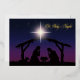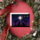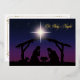 Esta hermosa tarjeta de Navidad con escena de la Natividad tiene una vista nocturna del establo y el pesebre con el niño Jesús y María y José mirando al Señor Jesús con una estrella brillante encima. Las palabras "Oh Noche Santa" están hechas con auténtica hoja de oro en la esquina superior derecha en el anverso. El reverso tiene un marco de aspecto dorado SIMULADO con texto personalizable en azul marino que se puede cambiar para decir lo que desees.