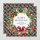 Elegante tarjeta de negocios de fiestas con plaid de búfalo caqui con una corona de ramas, acebo, bayas, adornos y piñas en acuarela sobre un fondo de plaid de búfalo caqui adornado con estrellas. Personalice fácilmente esta clásica tarjeta de Navidad de negocios con el nombre de su empresa.