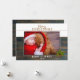 Tarjeta de Navidad de pino de madera oscura rústica. Tarjeta de vacaciones festivas con Felices Fiestas, nombre de la familia y el año en una escritura moderna dorada y blanca - personalice con su texto. El fondo es blanco y textura de madera oscura. El diseño tiene hojas de pino verdes. Inserte su foto familiar favorita en la plantilla y haga una tarjeta de Navidad especial para su familia y amigos.