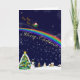 Escena del navidad con el árbol de navidad, el muñeco de nieve, y las casas en el fondo, y Santa que vuela sobre el arco iris hacia el cielo nocturno. Ilustraciones únicos y hermosos para las tarjetas de Navidad.