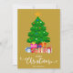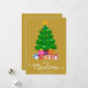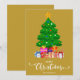 Color de fondo dorado Feliz Navidad en tipo de letra de estilo script con un gráfico de un árbol de Navidad y regalos envueltos debajo del diseño. Esta tarjeta de Navidad está diseñada para que puedas cambiar el color del fondo y también ingresar el nombre de tu familia. También puedes editar este diseño para cambiar el color de la palabra "Navidad" si lo deseas.
