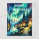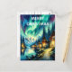 Encantado País de las Maravillas Invernal, Tarjeta de Navidad, Una pintura serena que representa una cabaña rústica ubicada entre árboles altos en un entorno forestal tranquilo.