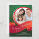 Tarjeta de felicitación de Navidad elegante y con estilo con un banner rojo con las palabras Feliz Navidad con ramas de pino y un marco redondo para tu foto de vacaciones sobre un fondo verde de abeto. Personalízala con tu información y añade tu foto familiar única y ya estarás listo para enviar.