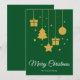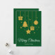Feliz Navidad en una fuente de caligrafía elegante con diseño de árbol de Navidad colgante, regalos, estrella y bola de Navidad. Esta tarjeta de Navidad de color verde está diseñada para que puedas cambiar el color del fondo y también ingresar el nombre de tu familia o eliminarlo si deseas tener solo el diseño sin la línea del apellido.
