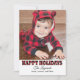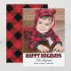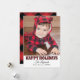 La tarjeta de foto moderna "Felices Fiestas" incluye un gran espacio para foto y texto negro que se puede personalizar. Cuenta con un patrón rústico de cuadro de búfalo rojo y negro en los lados delantero y trasero de la tarjeta con nieve falsa.