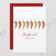 Esta sencilla tarjeta de vacaciones presenta mis originales chiles jalapeños pintados a mano con acuarela en rojo, verde y amarillo sobre un fondo blanco crujiente. Las palabras Feliz Navidad están escritas en una tipografía moderna de pincel. Personaliza con el nombre de tu familia. La tarjeta de estilo latino se revierte a un color rojo intenso y sólido. Una opción linda para enviar a amigos y familiares en esta temporada de Navidad. Para ver más diseños, visita DoTellABelle en Zazzle.